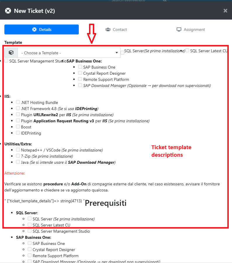 When attempting to open a new ticket, the contents of the saved ticket template descriptions are displayed next to the dropdown menu for selecting the ticket template, which is confusing.